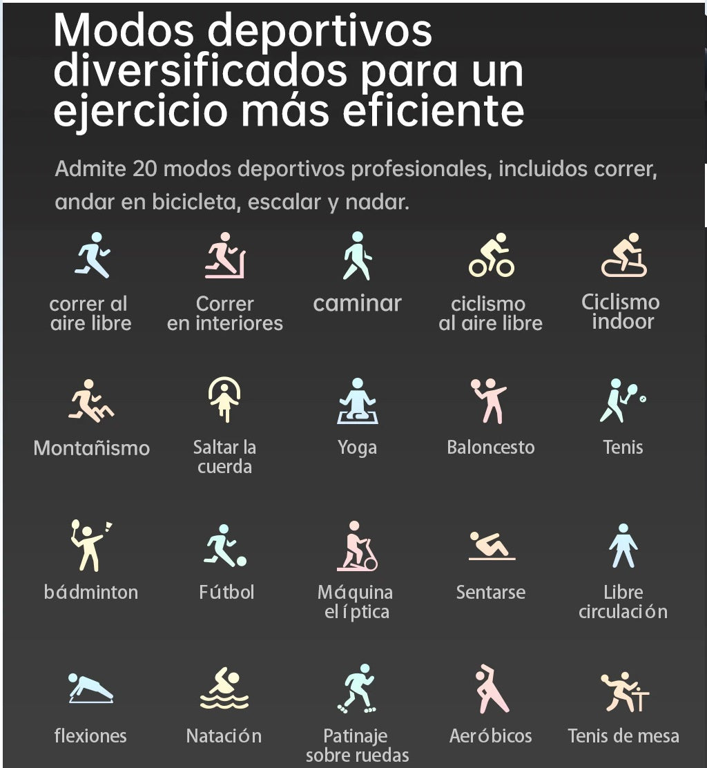 - Función: Pasómetro, Monitorizador de actividad física, Rastreador de sueño, Mensaje recordatorio, Recordatorio de llamada, Reloj despertador, Rastreador de ritmo cardíaco, Cuenta regresiva, Calculadoras y Más.